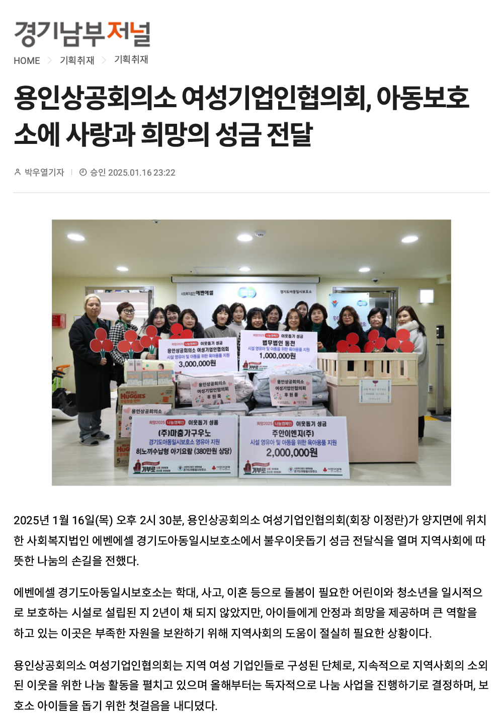 ±â»ç ¹Ù·Î°¡±â - ¿ëÀλó°øÈ¸ÀÇ¼Ò ¿©¼º±â¾÷ÀÎÇùÀÇȸ, ¾Æµ¿º¸È£¼Ò¿¡ »ç¶û°ú Èñ¸ÁÀÇ ¼º±Ý Àü´Þ < ±âȹÃëÀç < ±âȹÃëÀç < ±â»çº»¹® - °æ±â³²ºÎÀú³Î