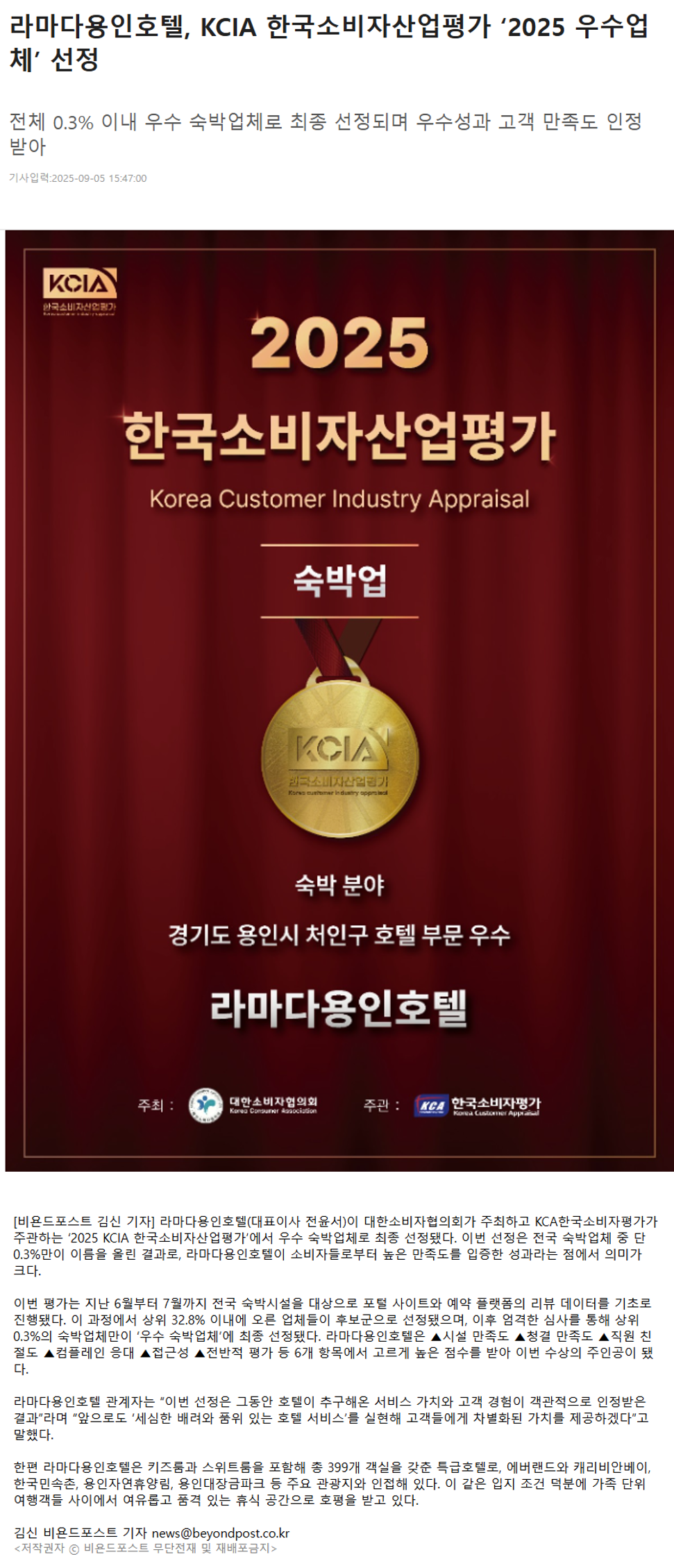 ¶ó¸¶´Ù¿ëÀÎÈ£ÅÚ, KCIA Çѱ¹¼ÒºñÀÚ»ê¾÷Æò°¡ ¡®2025 ¿ì¼ö¾÷ü¡¯ ¼±Á¤