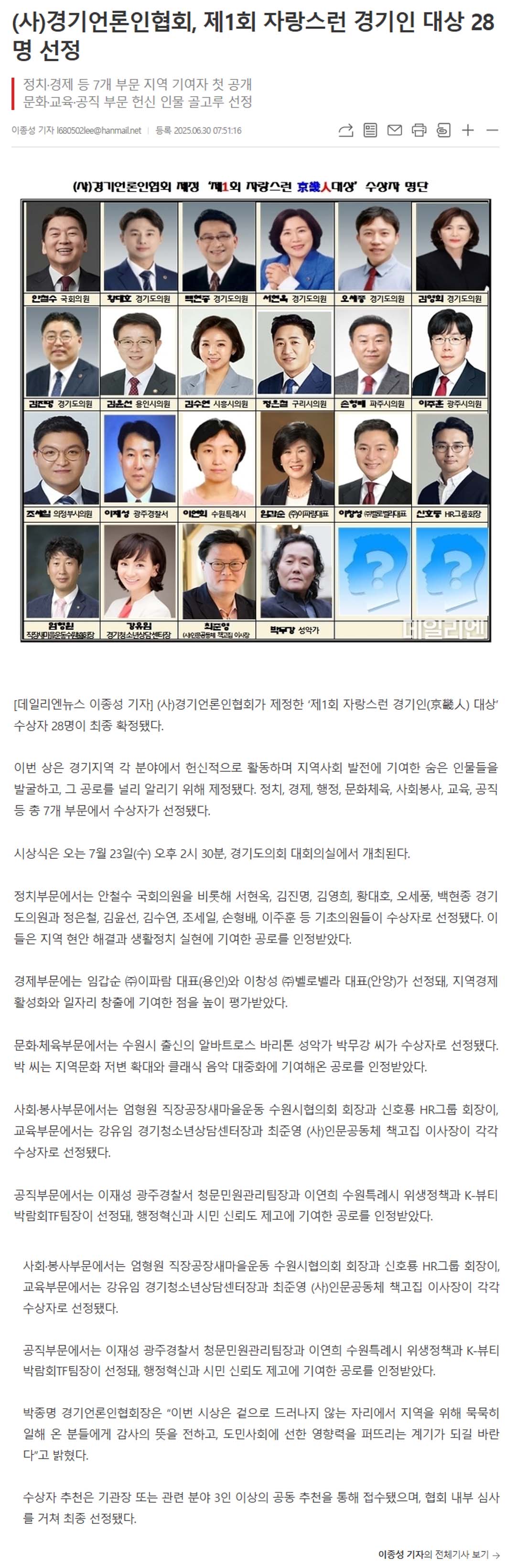 (»ç)°æ±â¾ð·ÐÀÎÇùȸ, Á¦1ȸ ÀÚ¶û½º·± °æ±âÀÎ ´ë»ó 28¸í ¼±Á¤